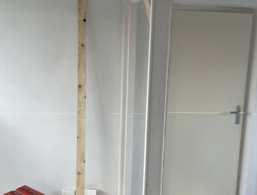 In dit project is de bovenste verdieping gerenoveerd met de toevoeging van een extra badkamer. De badkamer is ingericht met lichtgrijze tegels, die een moderne en frisse uitstraling geven. Daarnaast zijn er houtkleurige elementen toegevoegd, zoals het wastafelmeubel en het doucheframe, wat zorgt voor een warme en harmonieuze sfeer. Deze combinatie van materialen creëert een en functionele ruimte.